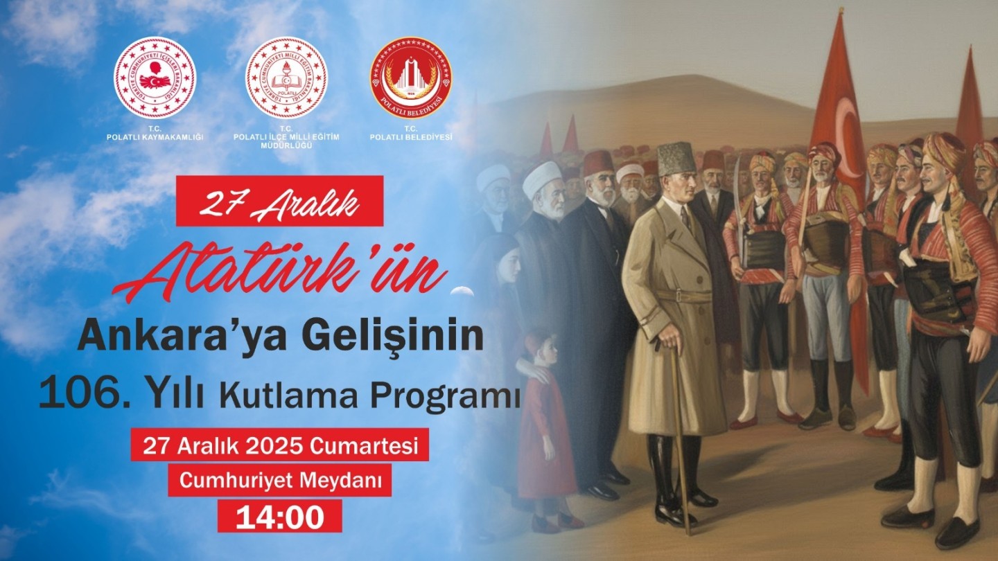 Polatlı Kaymakamlığı, Polatlı Belediyesi ve Polatlı İlçe Milli Eğitim Müdürlüğü iş birliğiyle Ulu Önder Mustafa Kemal Atatürk’ün Ankara’ya Gelişinin 106. Yıl dönümü nedeniyle kutlama programı düzenlecek. Atatürk’ün Ankara’ya gelişi, 27 Aralık Cumartesi Günü Saat 14.00’da Cumhuriyet Meydanı’nda Ay Yıldız Koreografisi ve birbirinden farklı etkinliklerle büyük bir gurur ve coşkuyla kutlanacak.