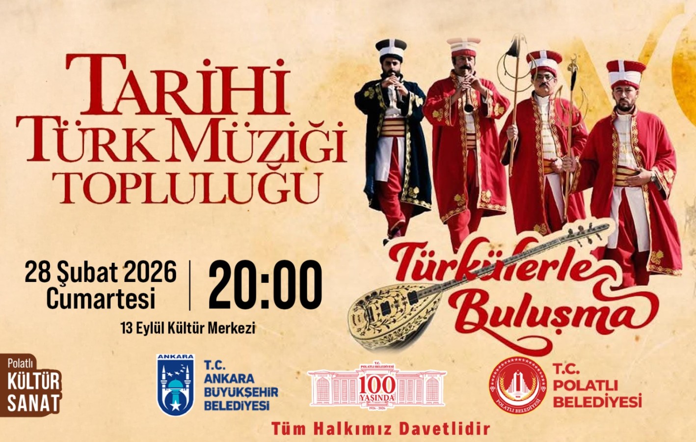 Ankara Büyükşehir Belediyesi ile Polatlı Belediyesi iş birliğiyle “Tarihi Türk Müziği Topluluğu Türkülerle Buluşma” Konseri ise 28 Şubat Cumartesi günü saat 20.00’de Yeni Belediye Binası 13 Eylül Kültür Merkezi’nde gerçekleştirilecek. Ramazan Etkinlikleri kapsamında düzenlenecek konserde Türk müziğinin seçkin eserleri ve hafızalarda yer eden türkülerini seslendirilecek olan Tarihi Türk Müziği Topluluğu; dinleyicilere keyif dolu bir müzik ziyafeti sunacak.